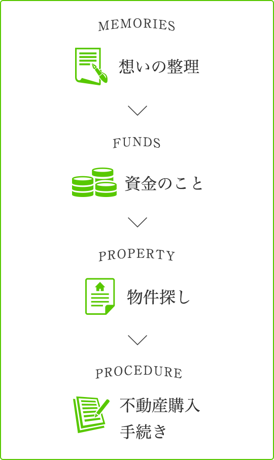 良い中古物件は予想以上に早く買い手がついてしまい、二度と同じ物件に出会うことはありません。つまり、中古物件の購入では、新築を買うとき以上にスピーディーに様々な決断を求められるのです。そのために大切なのがあらかじめしっかりとした判断基準を自分の中に持っておくということ。心を整理し、条件をしっかり決めておけば時間のない中でも冷静に価値ある物件を選ぶことができます。住宅購入の準備は、素敵な物件に出会う前から始まっています。ぜひ今から始めてみませんか?