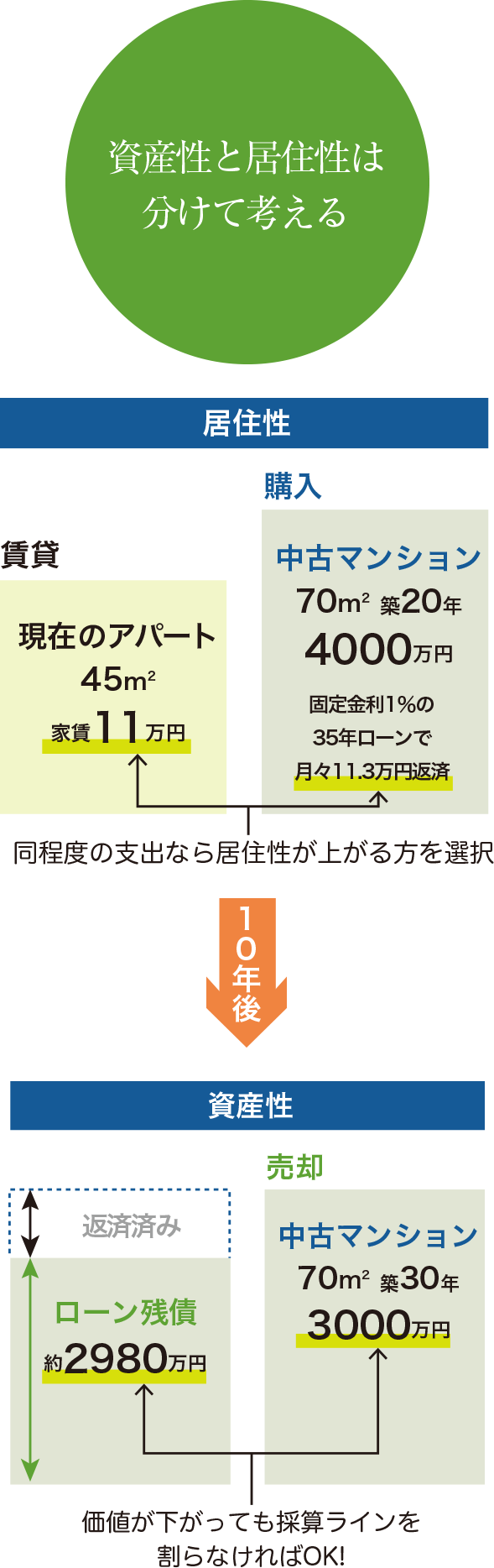 たとえば、4000万円で購入した中古マンションが10年後に3000万円の資産価値となったとしても、その10年の間にローンの残債も減っています。中古マンションがローン残債よりも高く売れれば良いと考えることができます。