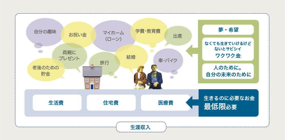 まずは、生きていく上で最低限必要なお金をベースに、自分や家族がしたいこと、望むことを挙げてみましょう。