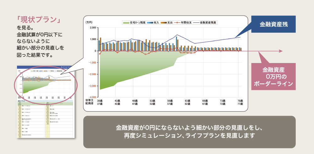 ステップ1で組み立てたライフプランをもとに、今後の収支や金融資産残高の推移をみながら、