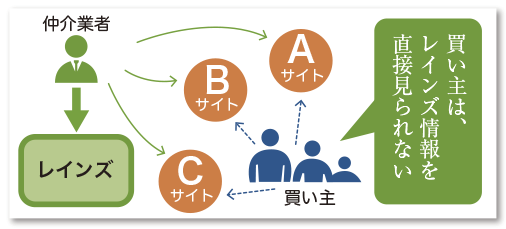 売り出される物件情報は基本的にはこの「レインズ」に掲載され、業者間での取引がなされている。売主と仲介会社の契約形態によってはレインズに情報が掲載されるまでの規定時間に若干の違いがあり、レインズより先に仲介会社のサイトに掲載されているというケースもある。
