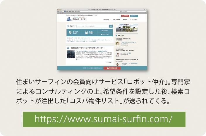 コストパフォーマンスが高い順に並べた「コスパ物件リスト」を送付してくれるサービス(有料)。